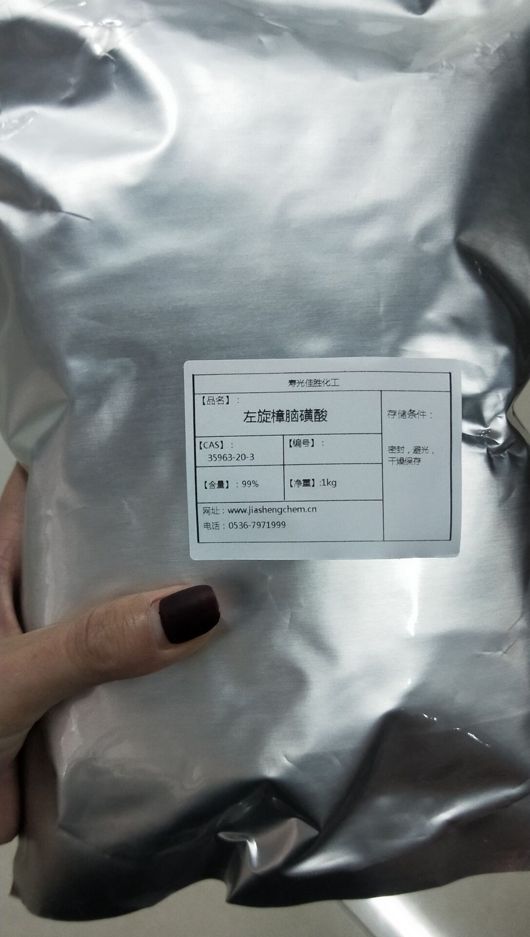生产方法:由樟脑与硫酸反应而得。将樟脑、乙酐加入反应锅中搅拌溶解。冷却后滴加硫酸,保持44-45℃反应48小时。然后冷却至6-7℃,结晶,过滤,用少量冰醋酸洗涤结晶,干燥得樟脑磺酸。
