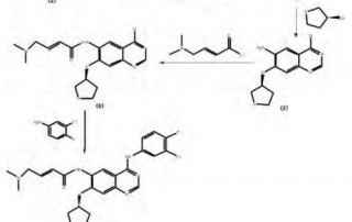阿法替尼(Afatimib),化学名为4-[ (3-氯-4-氟苯基)氨基]-6-{[4-(N,N-二甲基氨基)-1-氧代-2-丁烯-1-基]氨基}-7-[(S)-(四氢呋喃-3-基)氧基]喹唑啉,是由德国的勃林格殷格翰公司研发的肺癌治疗药物。该药于2013年7月在美国批准上市。作为一种多靶点小分子药物,属于表皮生长因子受体(EGFR)和人表皮受体2(HER2)酪氨酸激酶的强效、 不可逆的双重抑制剂。作为新型一线治疗药物, 临床上用于晚期非小细胞肺癌及晚期乳腺癌、肠癌的治疗;同时,阿法替尼被选作多种肿瘤类别研究用途,现正进行头颈癌等的Ⅲ期临床试验。