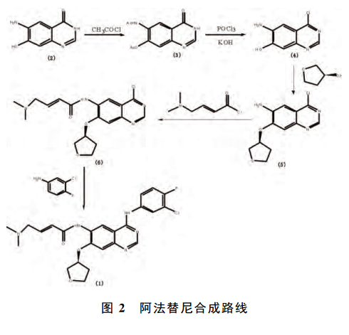 以6-氨基-7-羟基-3,4-二氢喹唑啉-4-酮(2)作为起始原料,与乙酰氯发生乙酰化反应得到6-乙酰胺基-7-乙酰氧基-3,4-二氢喹唑啉-4-酮(3),然后经三氯氧磷氯化、氢氧化钾水解得4-氯-6-氨基-7-羟基喹唑啉(4),与( S)-3-羟基四氢呋喃发生Mitsunobu反应得4-氯-6-氨基-7-[(S)-(四氢呋喃-3-基)-氧基]喹唑啉(5),与4-(N,N-二甲胺基)-2-烯-丁酰氯成酰胺得4-氯-6-{[4-(N,N-二甲基氨基)-1-氧代-2-丁烯-1-基]氨基}-7-[(S)-(四氢呋喃-3-基)氧基]喹唑啉(6) ,在三乙胺存在下3-氯-4-氟苯胺缩合生成阿法替尼。其合成路线见图2。此工艺原料易得,减少了反应步骤、降低了制备成本,整个过程操作简单,可控性强,没有苛刻的反应条件, 原料价格低廉,实验总收率为46.8%,适合工业化生产。